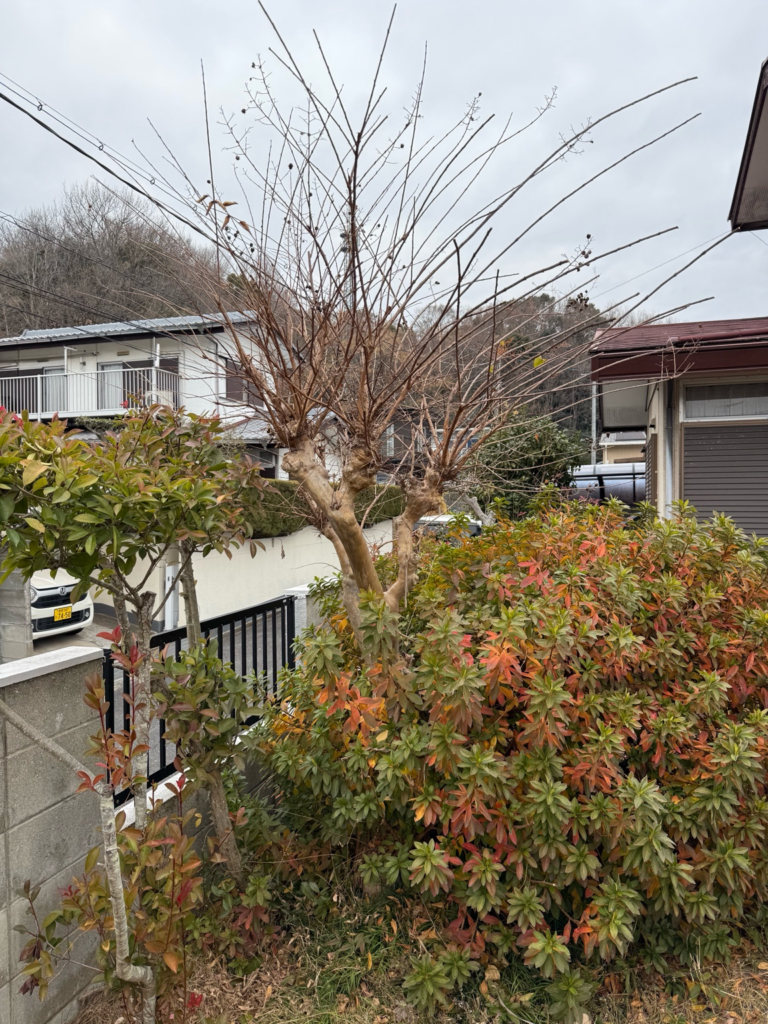 庭木は枝が伸び、敷地の外に少しはみでた状態でした。